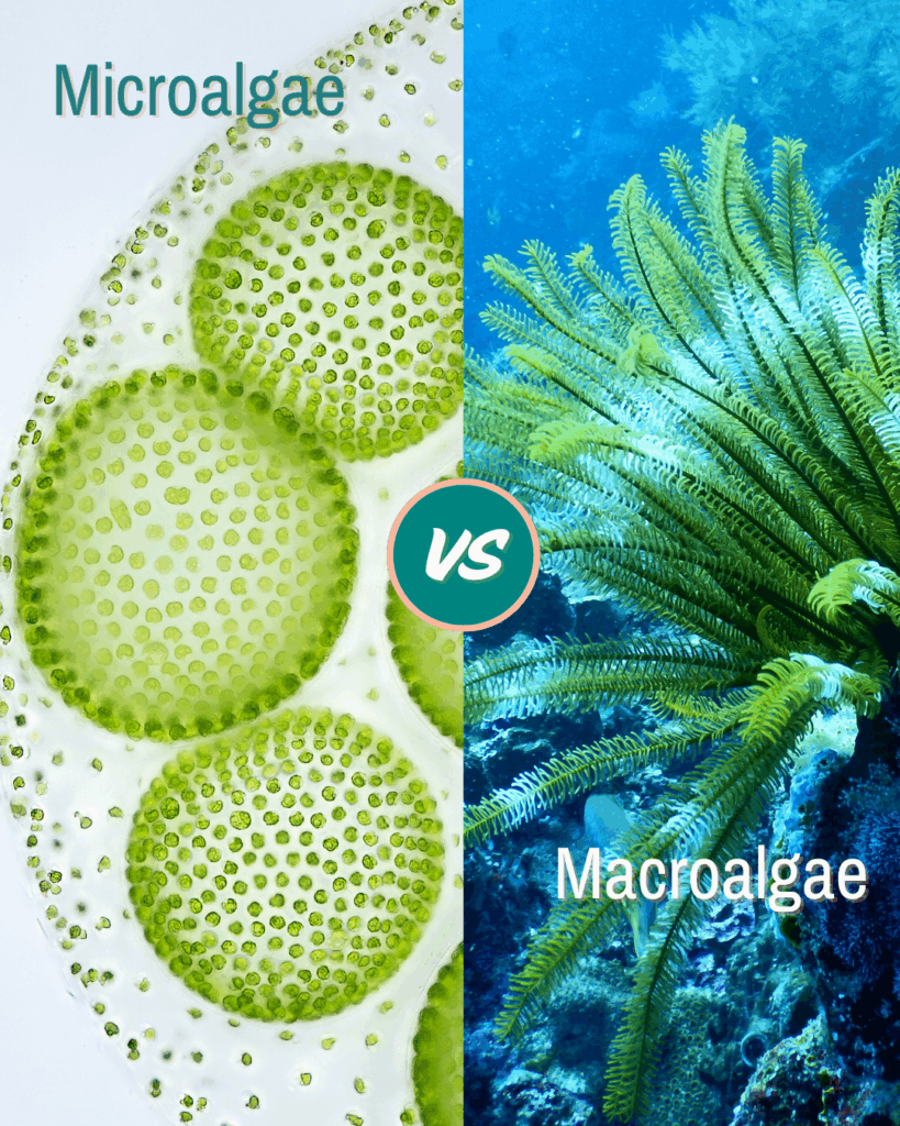 - Microalgae vs macroalgae: Macroalgae, such as seaweeds visible to the naked eye, are multicellular, whereas microalgae are microscopic unicellular organisms.